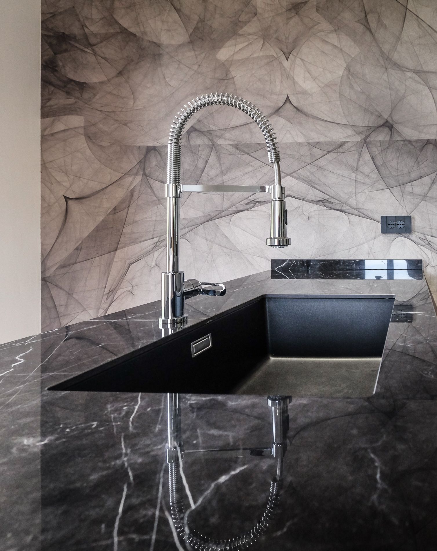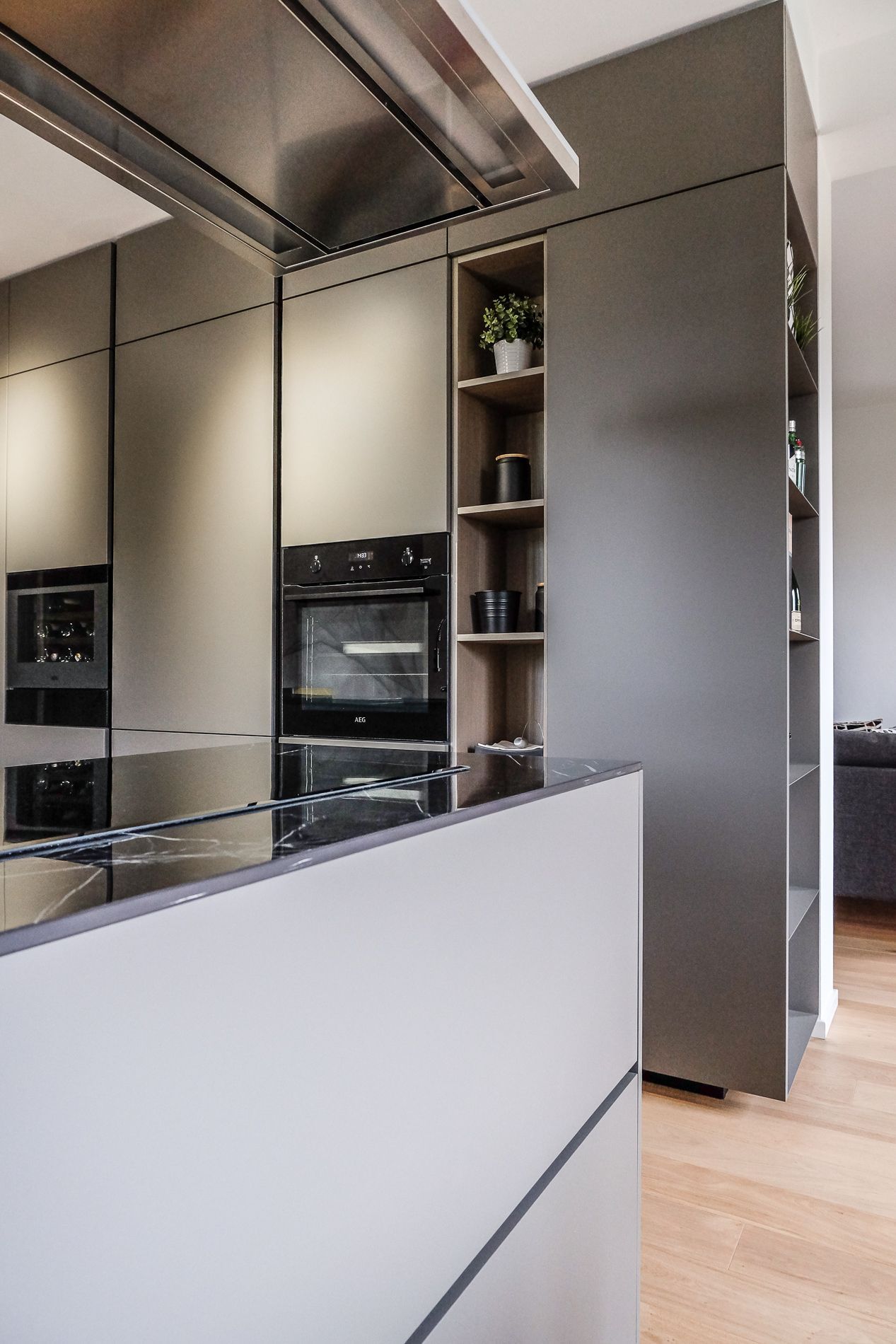 Un progetto di interni che ha visto la creazione di un grande spazio cucina dai toni decisi caratterizzato da una penisola con forma a “L” e una parete attrezzata con colonne a tutta altezza dove attrezzatura tecnica si fonde con vani dispensa e moduli a giorno capaci di creare una connessione con la zona pranzo e living.