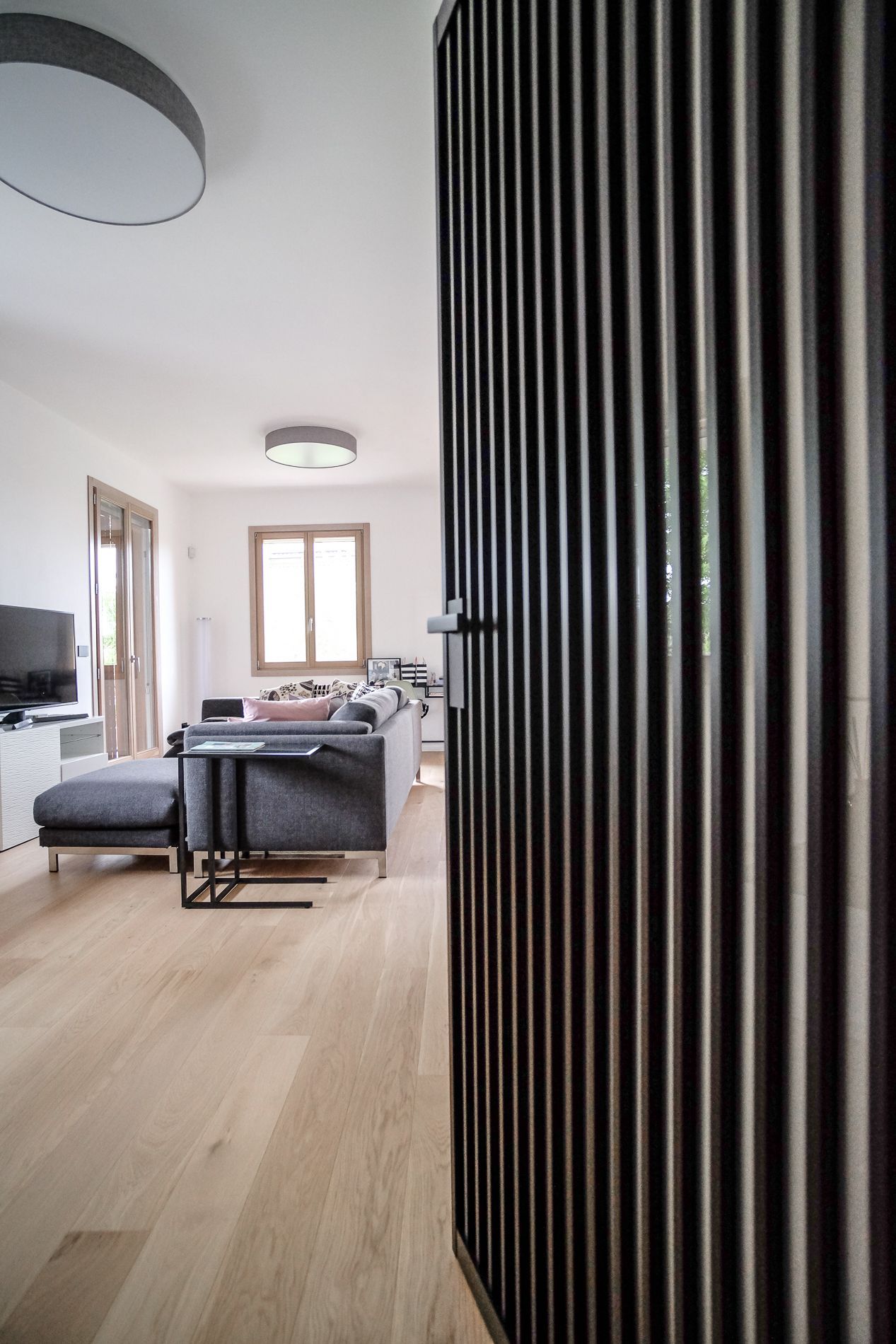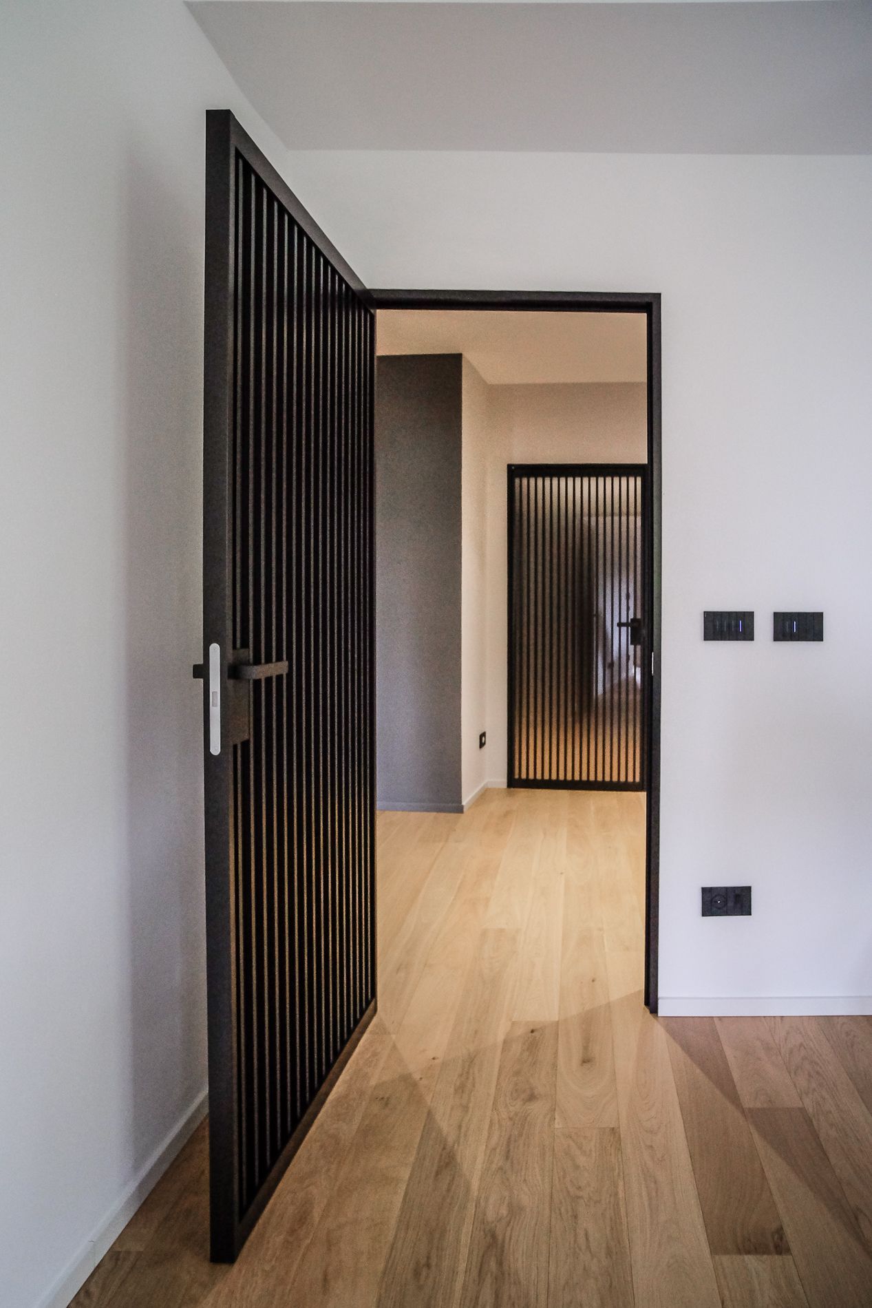 porte in alluminio brunito e vetro acidato, capaci di caratterizzare l’ingresso di ogni stanza.